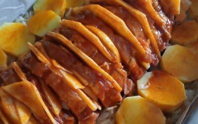 Ez a képen egy szeletelt–töltött sertéskaraj tepsiben, krumplival (Hasselback-stílusú sült hús). Itt a pontos recept, amivel ugyanilyet készíthetsz: 🥩 Szeletelt,…