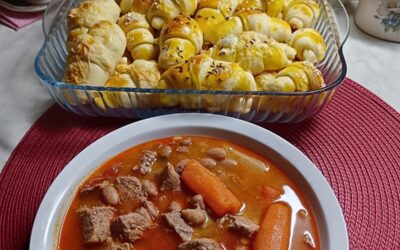 A képen egy finom, házias ebéd látható: 🥣 Szaftos húsos-babos zöldségleves 🥐 Sós, töltött mini kiflik / sós falatkák Ha…