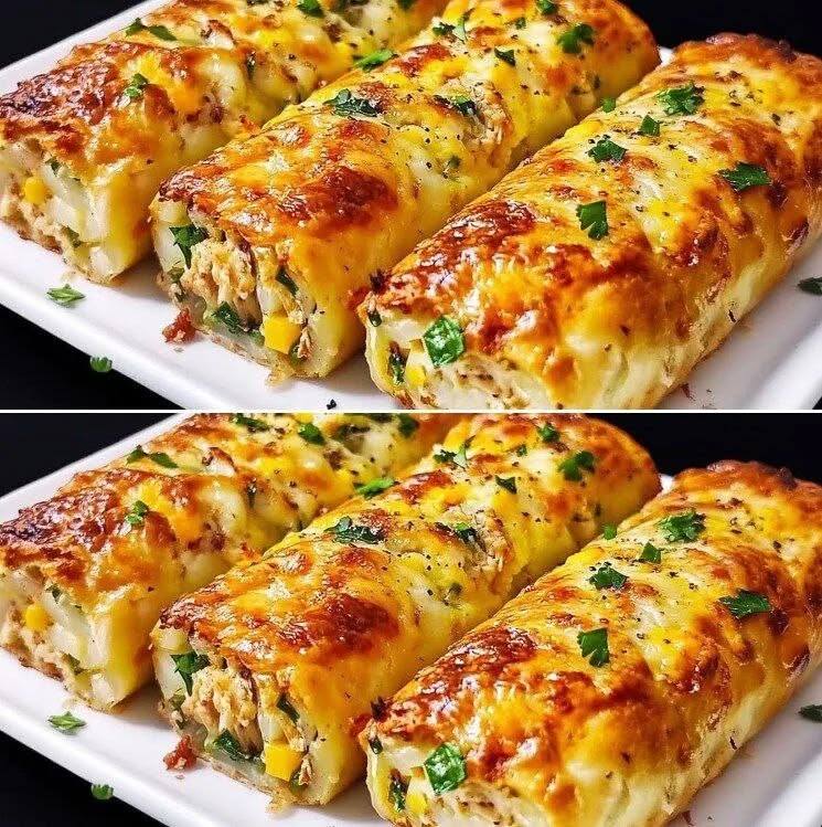 5. Tegyünk egy kis tölteléket mindegyik darabra, szórjuk meg cheddar sajttal , és sodorjuk rudakká .