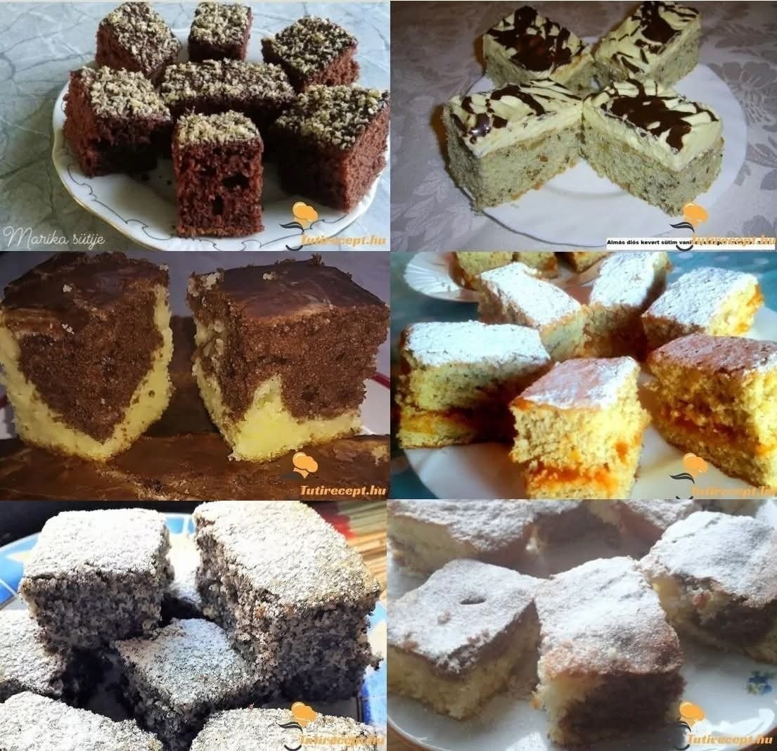 Szuper válogatás! A képen klasszikus kevert sütemények és krémes szeletek láthatók. Adok neked 4 nagyon népszerű receptet, amik tökéletesen illenek a fotókhoz:
