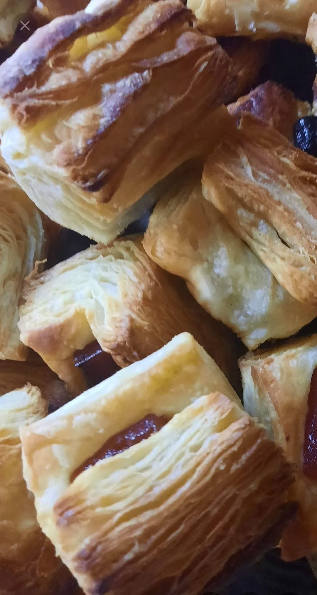 Ez a képen leveles tésztából készült lekváros vagy krémes falatkák láthatók – nagyon hasonlítanak a lekváros leveles tésztás párnácskákra / papucsokra (lekváros táskák).