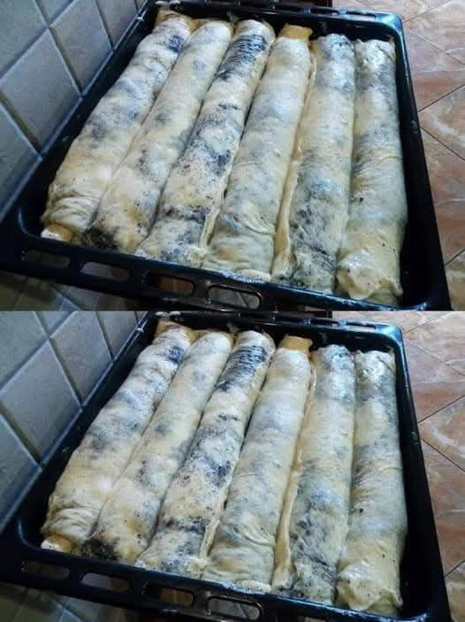 1,5kg liszt, nagy tepsibe elég (a képen látható méretű, kb 12 szál). Ebbe rakott 4 egész tojást, 2 jó kanál rideg zsírt, 7,5dkg élesztőt felfuttatott kevés langyos vízben 1 kanál cukorral. Majd rétes állagúra gyúrta sós langyos vízzel (csak annyi sót, hogy kellemes legyen a tészta, ne legyen sótlan se sós)