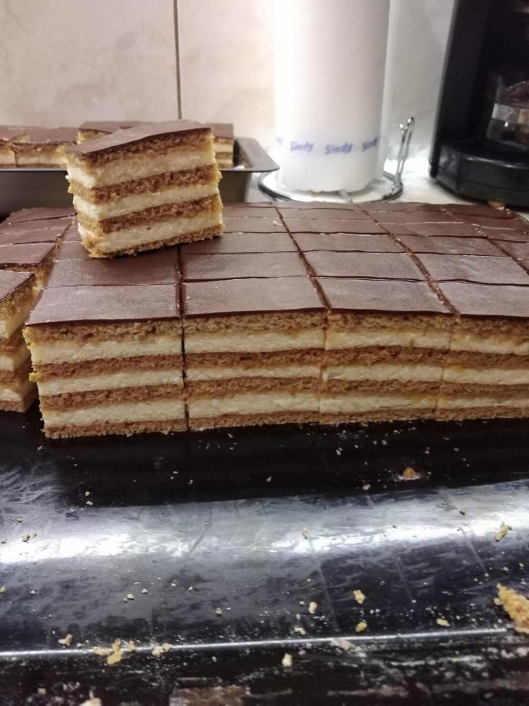 Ez az eredeti recept, annyit változtattam rajta, hogy minden lapra kenek krémet, és a krémre vékony rétegben baracklekvárt. A lapokat 180 fokon 5-6 perc alatt/lap sütöm
